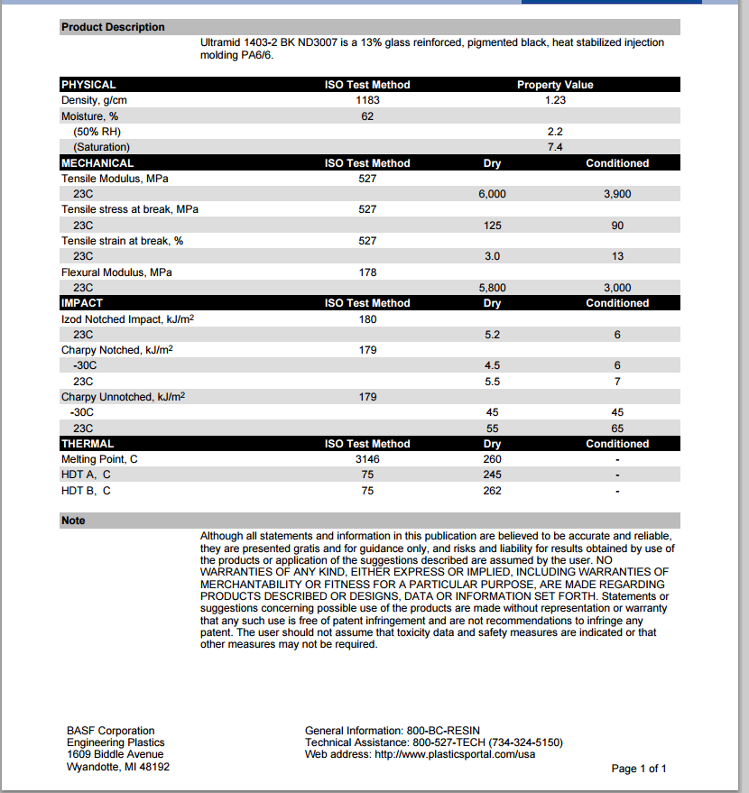 Ultramid 1403-2 BK ND3007是13%玻璃纤维增强,黑色颜料,热稳定注塑PA6 / 6