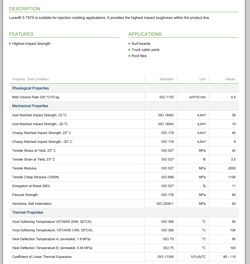 LURAN S 796M 增强的冲击强度 中等流动性 注塑级ASA
