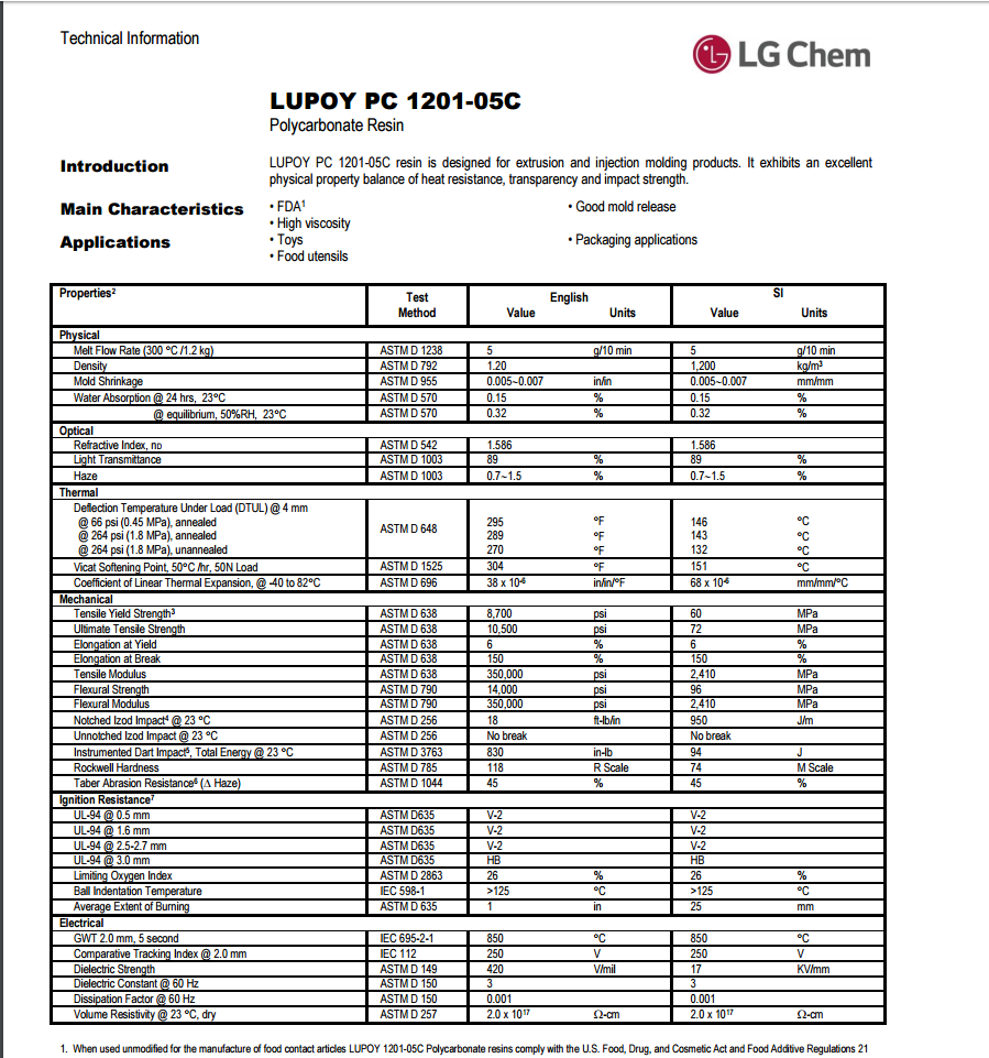 LUPOY PC 1201-05C FDA认证 良好的脱模性 抗紫外线 高粘度