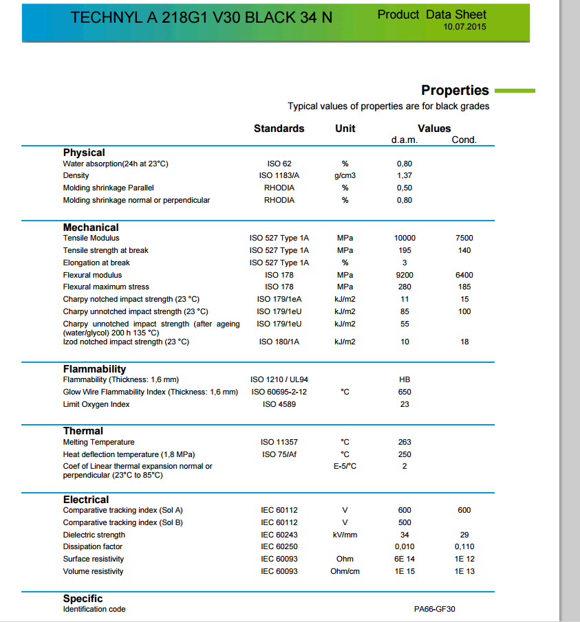 产品系列:醇性能的材料 聚酰胺66,增强30%的玻璃纤维,注塑。 这种等级显示了一个改进的长期老化后保留的属性在汽车冷却液体