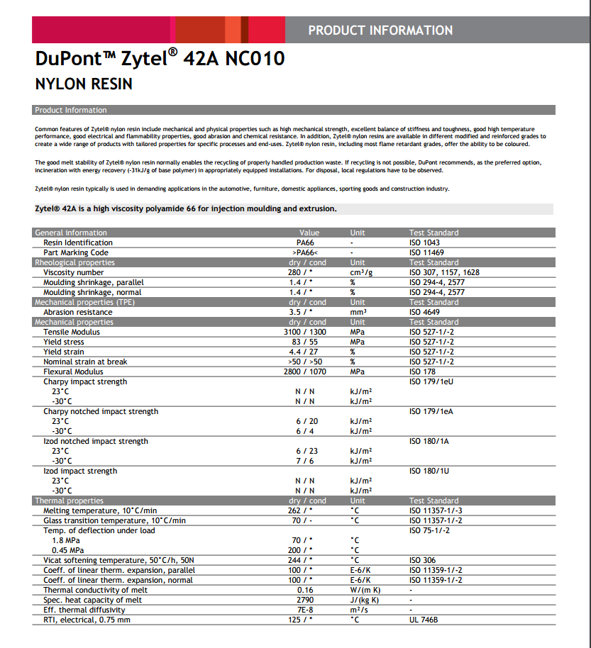 Zytel PA66 135F NC010 未增强,成核化,尼龙66