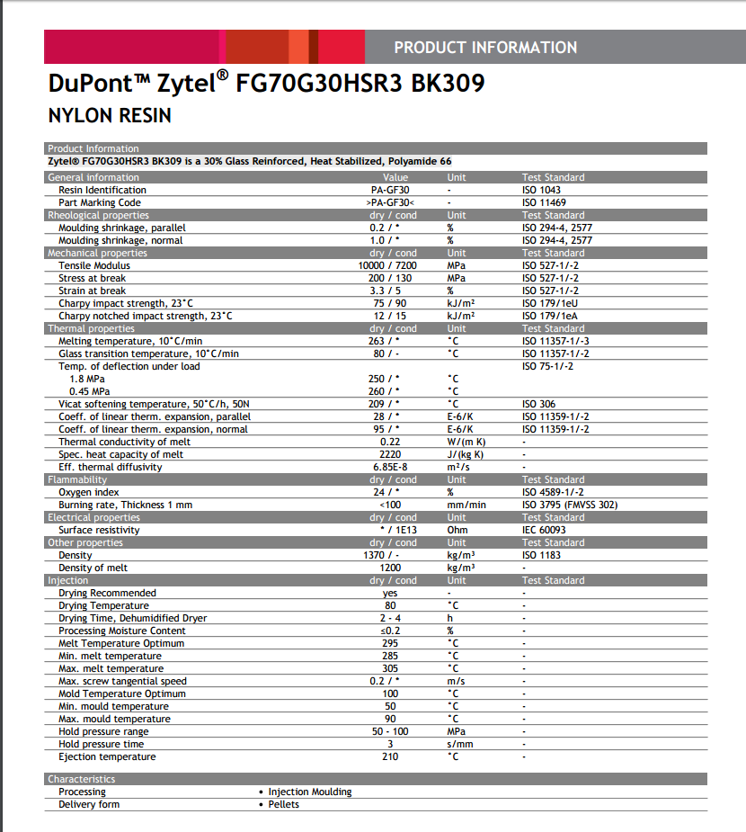 Zytel PA66 FG70G30HSLR2 BK039 30% 玻纤增强, 热稳定, 尼龙66