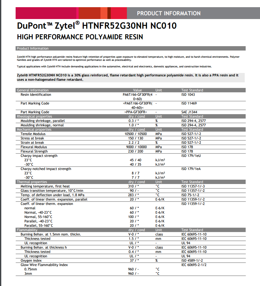 Zytel PPA HTNFR52G30NH NC010/BK337 30% 玻纤增强, 阻燃, 无卤, 高温尼龙, 高性能聚酰胺