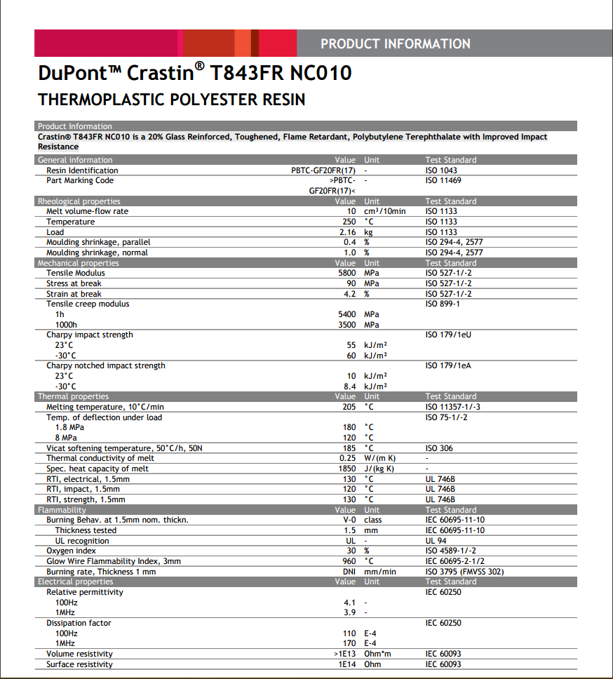 Crastin PBT T843FR NC010/BK851 20% 玻纤增强, 阻燃, 增韧, PBT