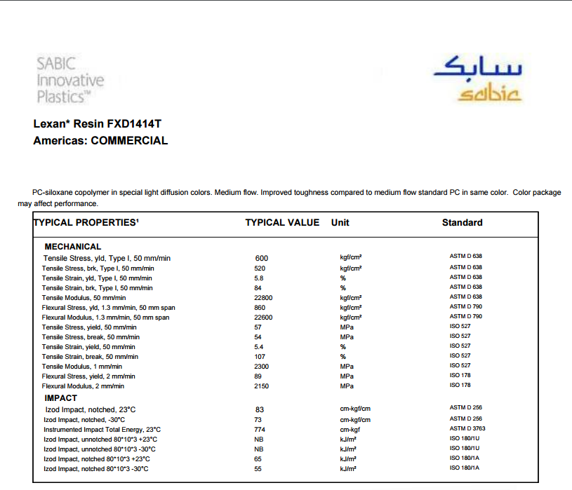 LEXAN PC FXD1414T 硅氧烷共聚物中特殊颜色 特殊光扩散级