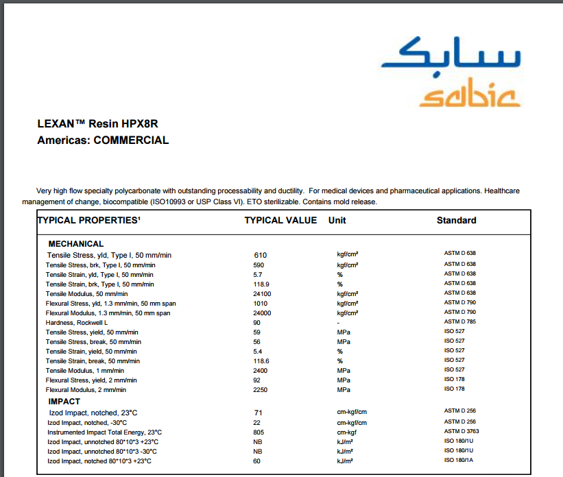 LEXAN PC HPX8R 具有优异的加工性能和延展性非常高的流量特种聚碳酸酯。医疗设备和制药应用