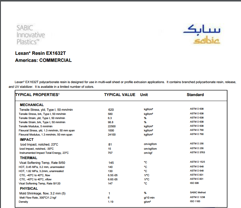 Lexan PC EX1632T 是专为使用多壁片材、型材挤压中的应用。它包含支化聚碳酸酯树脂,释放, 和紫外线稳定剂