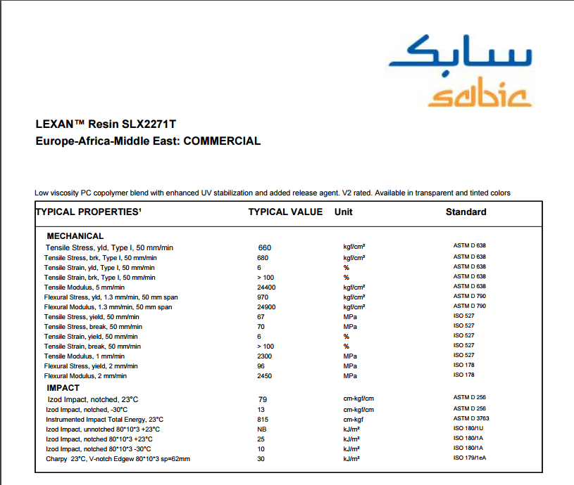 Lexan PC SLX2271T 具有增强的紫外稳定和添加脱模剂的低粘度聚合物共混物。V2额定