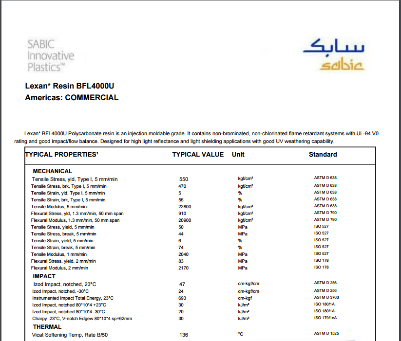 Lexan PC BFL4000U 一种注射模压级。它包含非溴化、非氯化和UL-94 V0阻燃体系