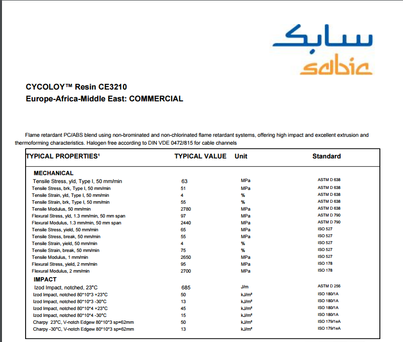 CYCOLOY PC+ABS CE3210 非溴化和非氯化阻燃 提供高冲击和优良的挤压 热成型特性