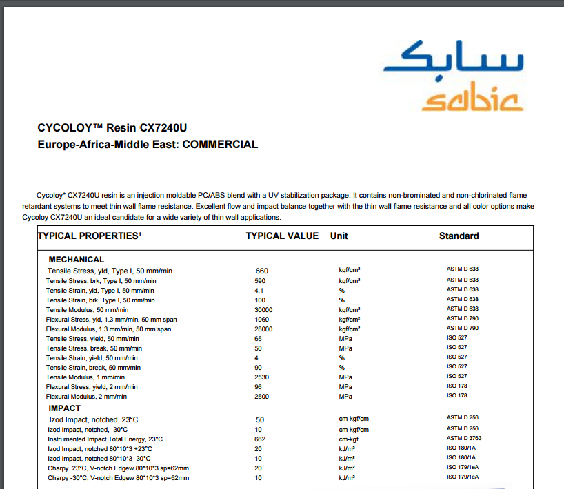 Cycoloy PC/ABS CX7240U 非溴化、非氯化阻燃PC/ABS。