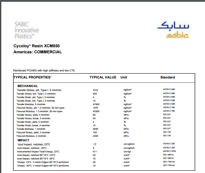 Cycoloy PC/ABS XCM850 非溴化、非氯化阻燃PC/ABS。耐磨性