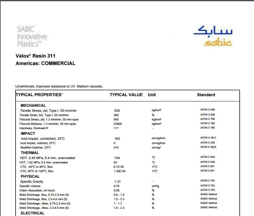 Valox PBT 312 未增强型。符合FDA 21CFR177.1660规范。中等粘度。 USP ClassVI级。
