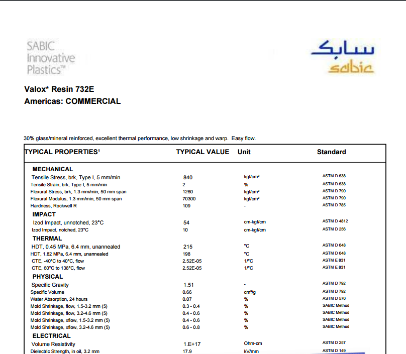 Valox PBT 732E 30% ²£ÏË/¿óÎïÔöÇ¿¡£ÓÅÒìµÄÈÈÐÔÄÜ£¬ÊÕËõÓëÇÌÇúС¡£Ò×ÓÚÁ÷¶¯¡£