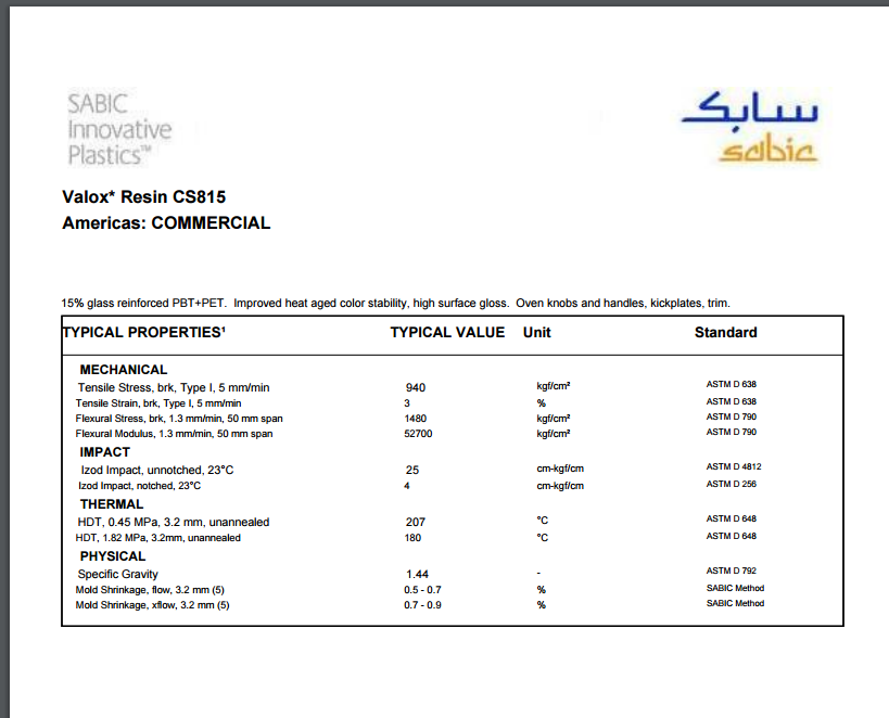 Valox PBT+PET CS815 15%玻璃 高表面光泽度。烤箱拉手、踢脚板、装饰。