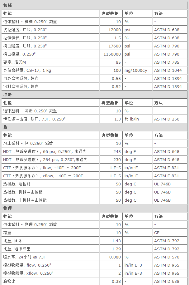 Noryl PPO FM4025 40% 玻纤增强/矿物增强,高模量结构泡沫塑料。试样厚度0.250"时,10%减重。