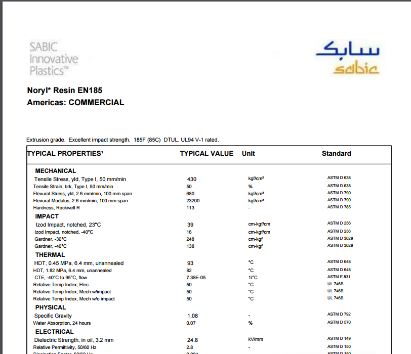 Noryl PPO EN185 挤塑级。优异的冲击强度。DTUL(载荷下挠曲温度):185F (85C)。 UL94 V-1额定值。