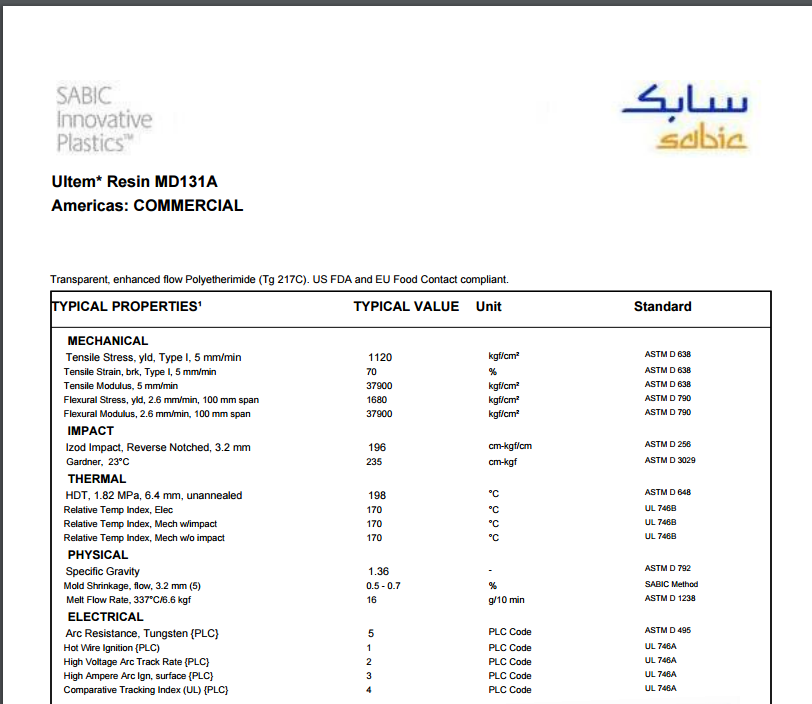 Ultem PEI MD131A 未增强型 高流动性 FDA