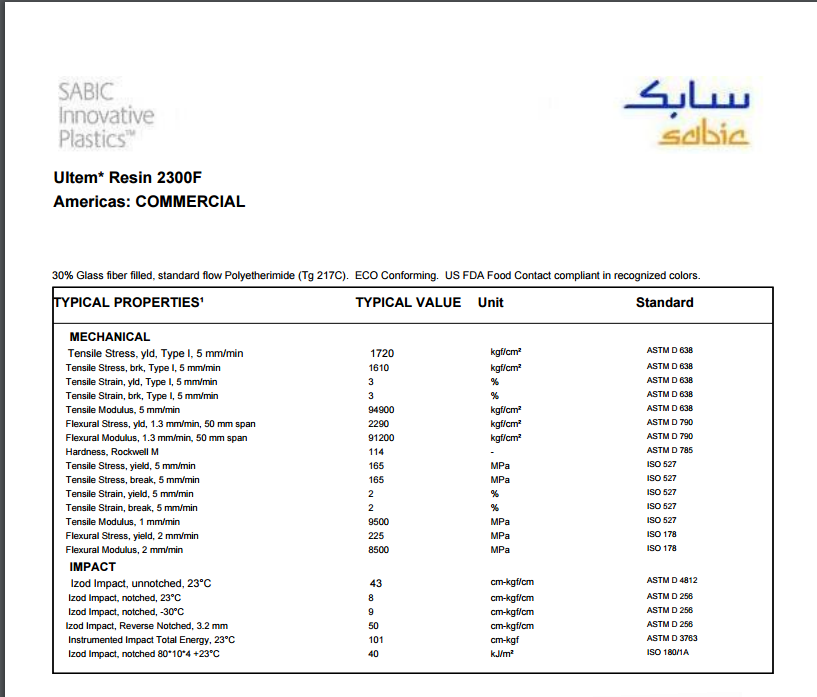 Ultem PEI 2300F 30%玻纤增强,美国食品药品管理局食品接触