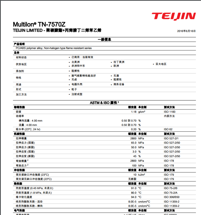 Multilon PC/ABS TN-7570Z 耐气候影响性能良好; 无卤; 无溴; 阻燃性