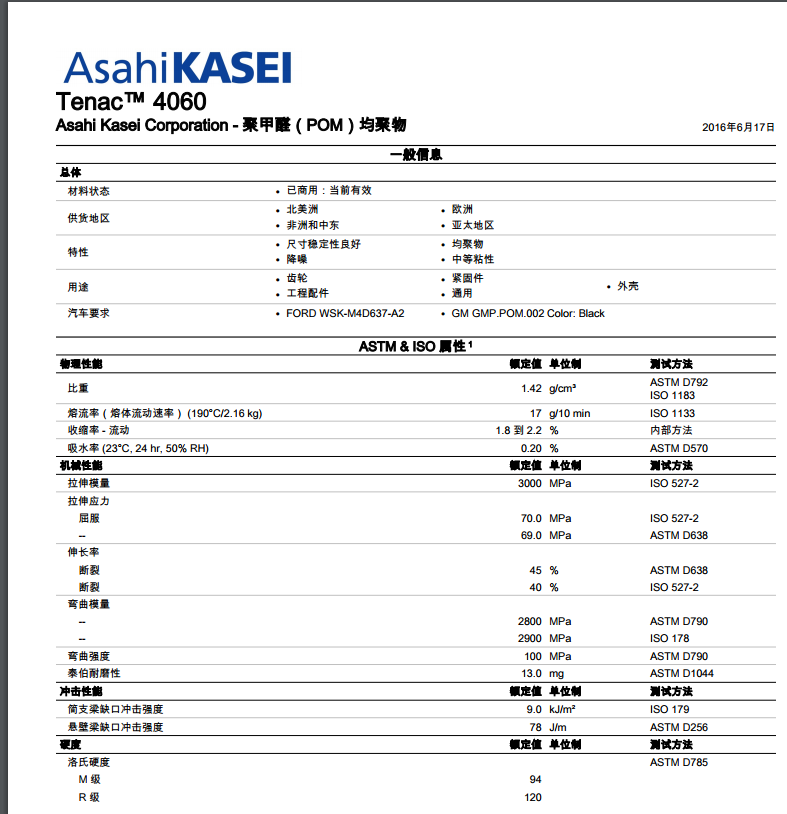 Tenac POM 4050 尺寸稳定性良好; 刚性,高; 高强度; 均聚物; 抗撞击性,高; 良好的抗蠕变性; 耐用性; 韧性良好; 中等