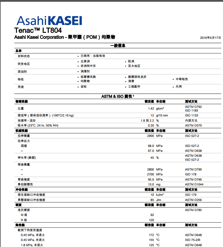 Tenac POM LT802 低摩擦系数; 均聚物; 良好的抗蠕变性; 耐磨损性良好; 润滑; 粘度,高