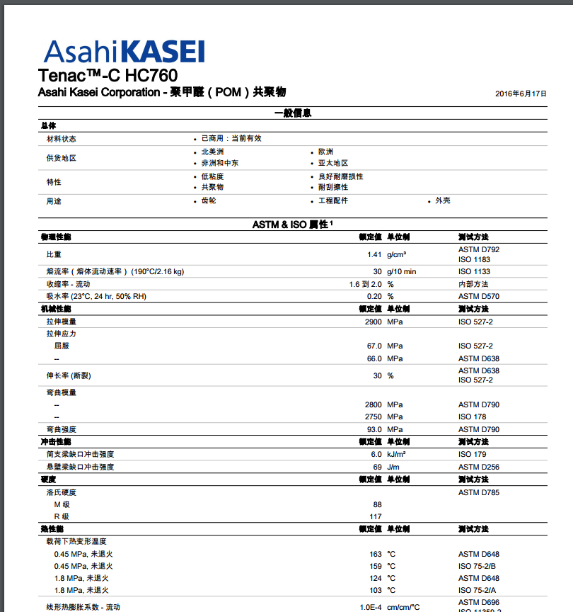 Tenac-C POM HC760 低粘度; 共聚物; 良好耐磨损性; 耐刮擦性